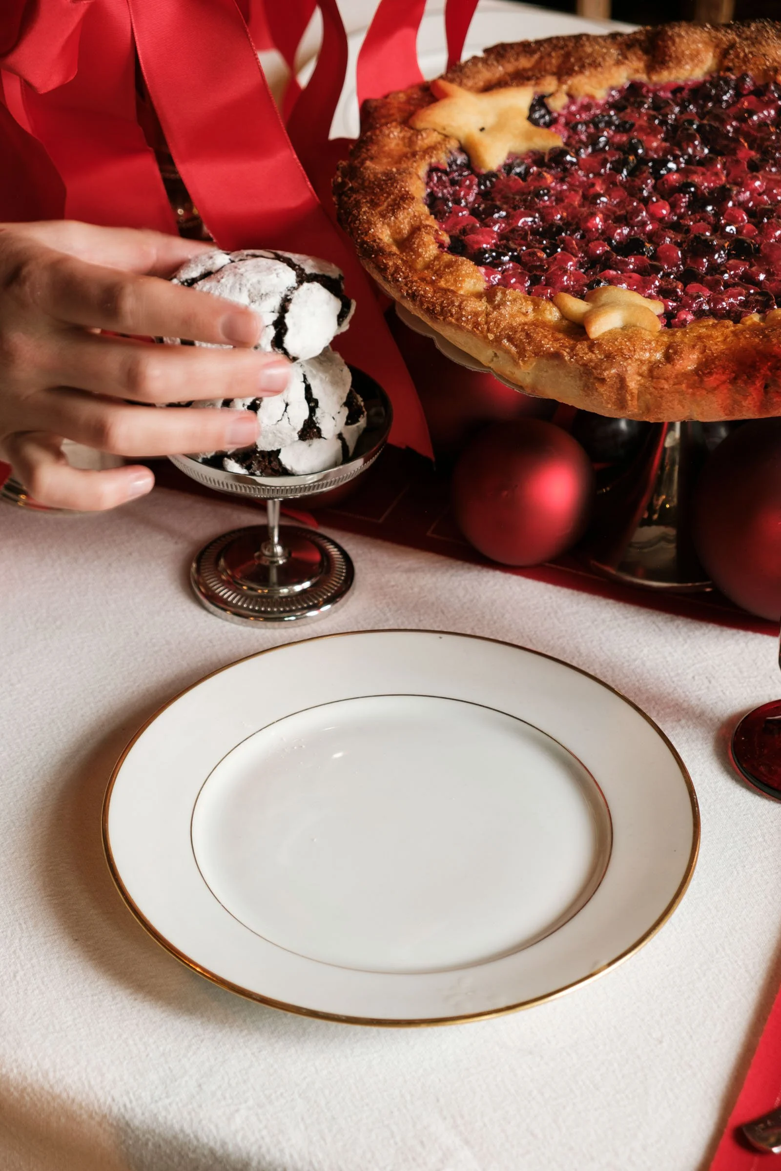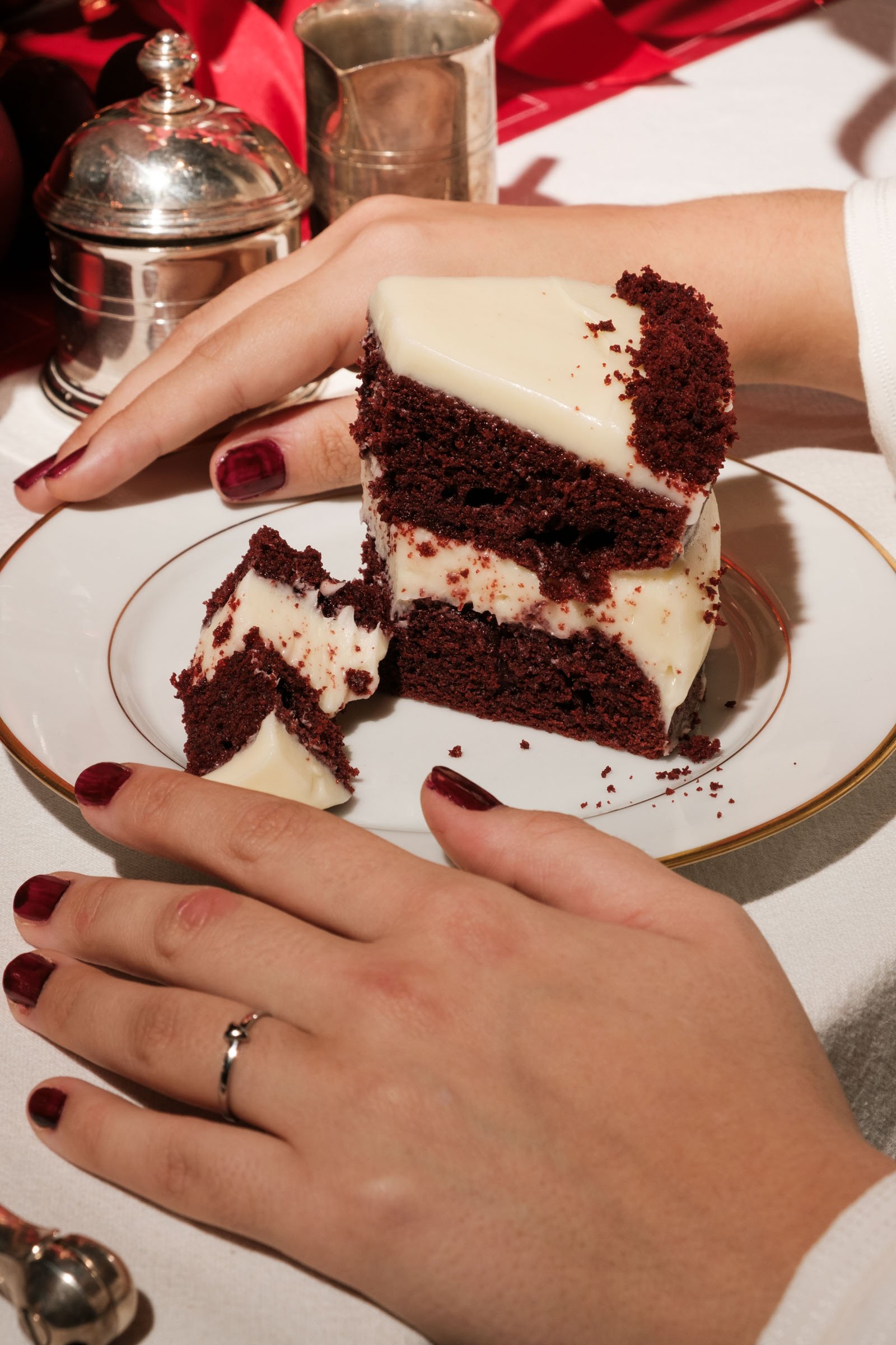 Compositie en styling: Het creëren van een rijke, feestelijke tafelsetting die de kwaliteit van Niki’s Bakery weerspiegelt.